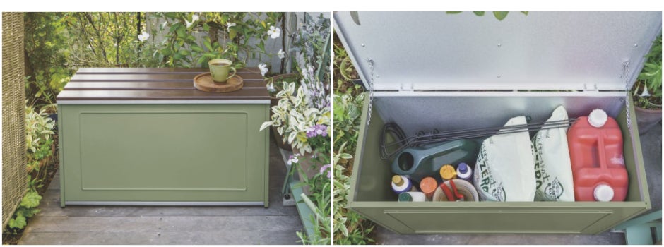 収納庫とベンチの1台2役、デザイン性に優れたガーデンファニチャー