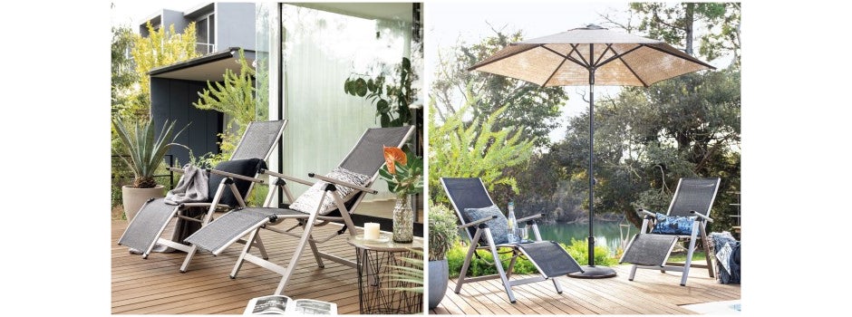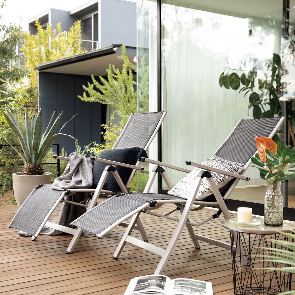 ガーデンでベッド気分のくつろぎを楽しめる、フットレスト付きリラックスチェア