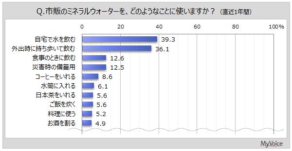 ミネラルウォーターの使用場面は(複数回答)、「自宅で水を飲む」が39.3%です。