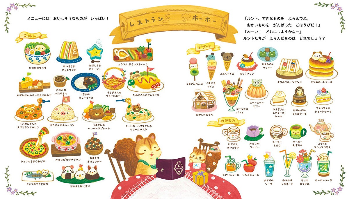 ● リスの家族と一緒に、お店屋さんでお買い物シュミレーションが楽しいです。 森の中のレストランの40種類以上の美味しそうなメニューはどれにしようか迷っても大丈夫。数えきれない組み合わせができるので、繰り返し読みたくなります。 どのページもかわいいイラストに優しさがあふれ、心がぽかぽかしてくる絵本です。 (うさぎや矢板店 山田恵理子さま) ● 表紙の絵の描き込みが、かわいくて、おもしろくて、じっと見てしまい、なかなか本文に進めませんでした。 温かみのある絵と色使い、食べ物のお店ばかりが続かず、間に、花屋さん、服屋さんなどが入ってるところもいいと思いました。 ずっと見ていられる絵本、何度も楽しめる絵本だと思いました。 (こどもの本のみせ ともだち 湯阪美智子さま) ● 全ページ可愛い過ぎて、ページをめくる手が全然進まない! セリフの無いぽわぽわもりの住人達からも楽しそうな声が聞こえて来ます。 "素敵な世界"が詰まった絵本! 是非多くの方にゆっくり開いてぽわぽわもりを覗いてみて欲しいです。 (未来屋書店大宮店 阿部夏子さま) ● かわいいもの好きなお子さんにはどストライクの絵本だとおもいました。 お店屋さんの中は、細かなところまで描かれていてひとつひとつ見てもかわいいです。 とくにレストランのメニューは、どれもこれもかわいくて素敵で選ぶのに一苦労です。 (六本松蔦屋書店 加藤美奈子さま) ● りすのルントがとってもキュートで、しっぽの帽子もどんぐりのバッグも細かいところが心をくすぐる可愛さでたまりません。 お店屋さんも細かくたくさんの商品が並んでいて子どもとどれが欲しい? と一緒に考えたりしたら楽しいだろうなぁと思いました! (Mさま) ● レストランホーホーのメニューページがたまらない!!! こんなレストラン、私も行きたいです! おみせやさんのページでルントと一緒に自分が欲しいものも選んじゃう! 読了後も隅々まで見て楽しめる!!! (くまざわ書店永山店 古川唯可さま)