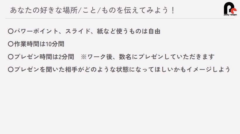 そして、平島から「ここで、みなさんにプレゼンコーナー『あなたの好きな場所・こと・ものを伝えてみましょう!』にチャレンジしてもらいます。作業時間10分で、2分間のプレゼン内容を考えてください。伝えた相手がどのような状態になってほしいかもイメージしましょう」と伝えられると、颯爽と作業に取り掛かります。