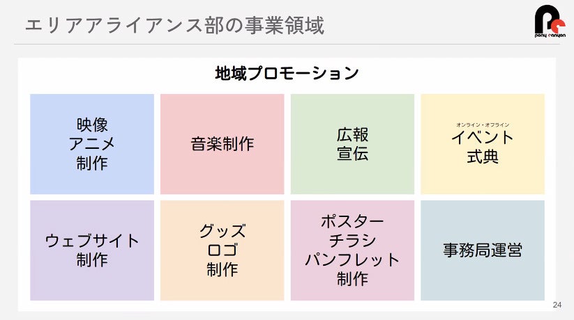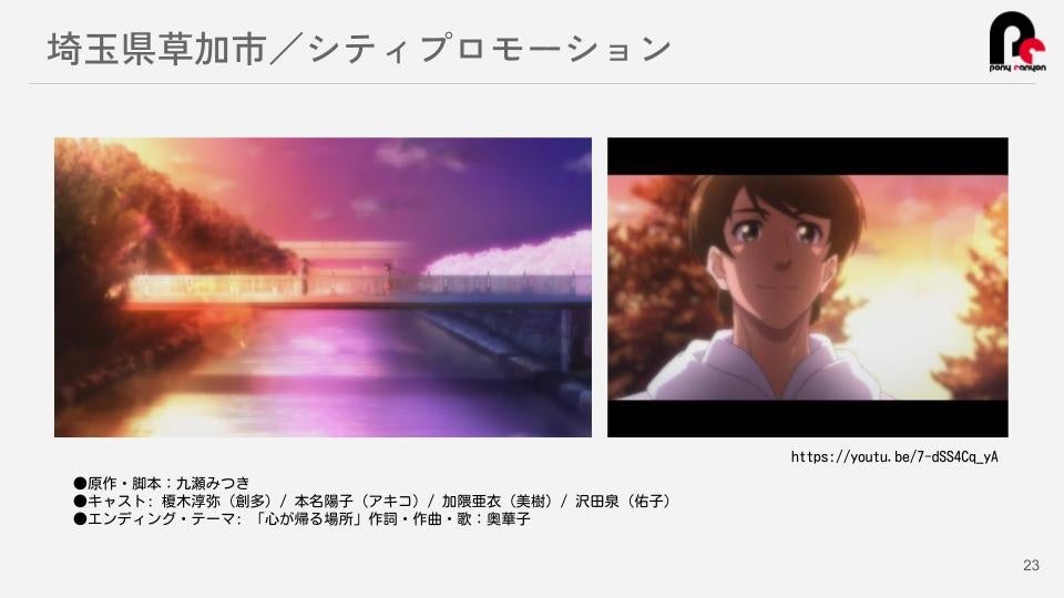 続いて、エリアアライアンス部の事業概要説明へ。「私たちが事業に取り組む意義は、地域活性に貢献することです。事例としては、福島県会津地方の教育旅行振興や白河市の観光プロモーション。また、アニメーションを絡めて、2018年に埼玉県草加市のシティプロモーションも行いました。ちなみに、プロモーション映像には人気アニメ作品で主人公を務めている声優さんが出演しているので、ぜひチェックしてください」と違った角度からも興味を惹きます。