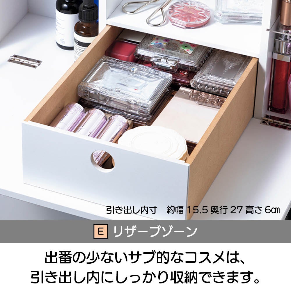 真ん中下部は、手前から奥(アイシャドウゾーンの下)まで続く引き出しです。出番こそ少ないけれど大事なコスメはこの中に。外から見る以上に容量があるので、他のゾーンに入りきらなかった物もしまっておけます。