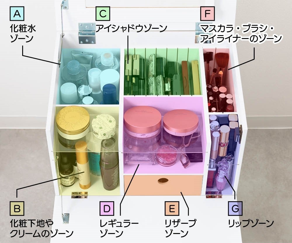 コスメのカテゴリーごとにゾーンを分け、多様な容器に適応できるように、サイズ感