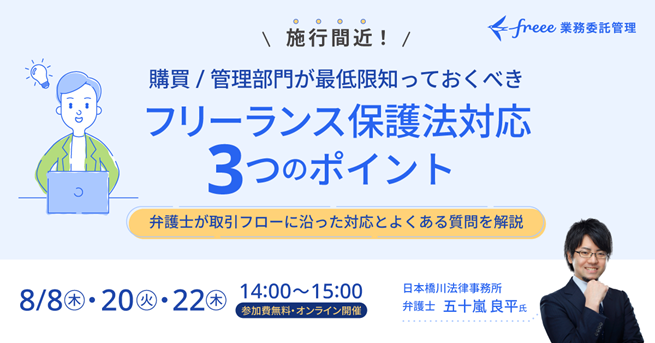 フリー株式会社(本社:東京都品川区、CEO:佐々木大輔、以下「freee」)は、8月8日、20日、22日の三日間、フリーランス保護法解説セミナーをオンラインにて開催します。本セミナーは、フリーランスや業務委託との取引を行っている企業、及び今後取引を検討している企業を対象としています。