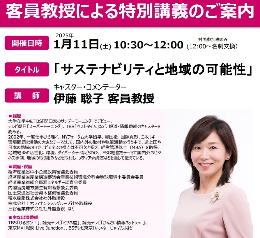 【事業創造大学院大学】伊藤聡子客員教授(キャスター・コメンテーター)による特別講義「サステナビリティと地域の可能性」を開催