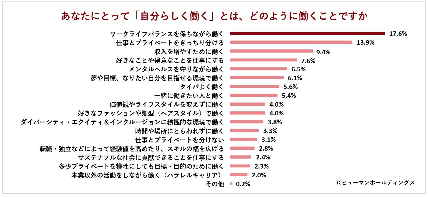 「自分らしく働くとは、どのように働くことですか」という質問に対し、「ワークライフバランスを保ちながら働く(17.6%)」と「仕事とプライベートをきっちり分ける(13.9%)」が多い結果となりました。仕事・キャリア・自己成長・ウェルネス・環境意識・持続性・社会貢献・多様性などライフスタイルや価値観を形成する要素が多数ある中で、バランスの取れた生活を送ることを重視していることが伺えます。