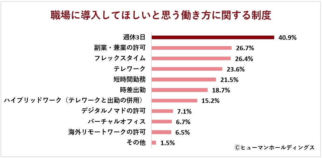 「職場に導入してほしい、または、すでに導入済みで今後も維持してほしい働き方に関する制度」(複数回答可)は、「週休3日(40.9%)」が最も多く、次いで「副業・兼業の許可(26.7%)」「フレックスタイム(26.4%)」という結果になりました。