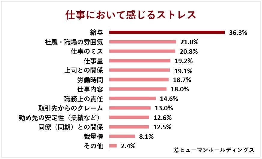 「仕事において、どのようなことにストレスを感じますか」(複数回答可)という質問に対し、最も多い回答は「給与(36.3%)で、次いで「社風・職場の雰囲気(21.0%)」、「仕事のミス(20.8%)」となりました。