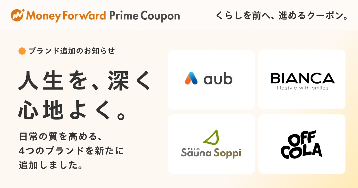 マネーフォワードホーム株式会社は、お金の見える化サービス『マネーフォワード ME』プレミアム会員限定「Prime Coupon(プライムクーポン)」において、本日2026年2月6日(金)より新たなクーポンを提供開始します。「人生を、深く心地よく」をテーマに、コンディションメーカー「aub(オーブ)」、美容健康再生医療の「BIANCA CLINIC(ビアンカクリニック)」、サウナ専門ショップ「Metos Sauna Soppi(メトスサウナソッピ)」、極上のオフタイムを過ごすための次世代のクラフトコーラ「OFF COLA(オフコーラ)」を新たな提携ブランドとして迎えました。