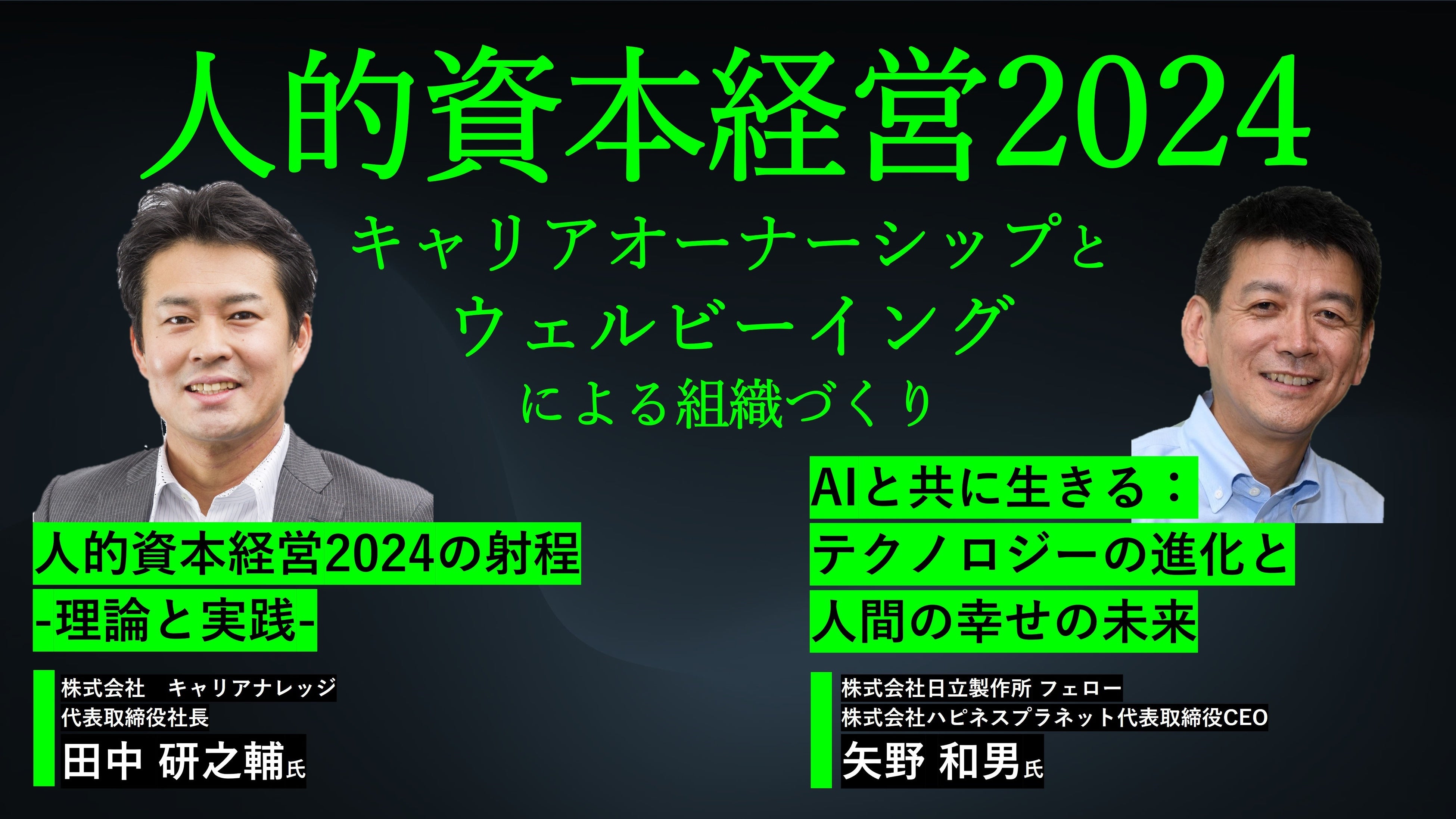 基調講演では法政大学教授でキャリアナレッジの田中研之輔社長が、人的資本の最大化とウェルビーイングな組織づくりの実践的事例や最先端のキャリア開発を交えた今後の見通しを紹介。特別講演では日立製作所フェローでハピネスプラネットの矢野和男CEOが、幸せで生産的な組織のデータに基づく知見をAI時代にいかに生かすかについて説明します。