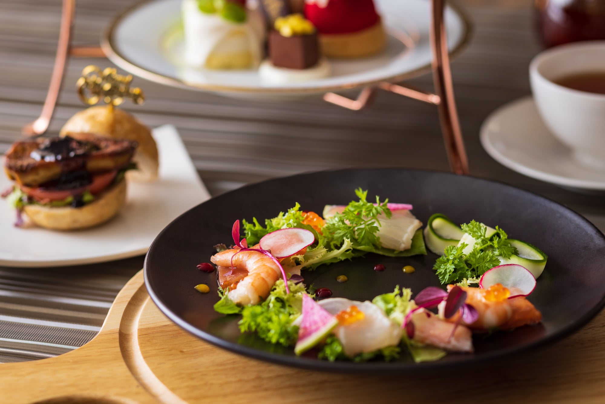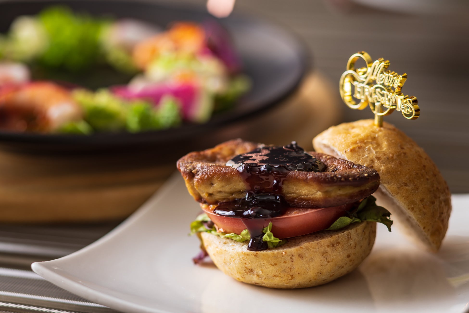 ⿂介の彩りサラダ リース仕⽴て、ミニフォアグラバーガー