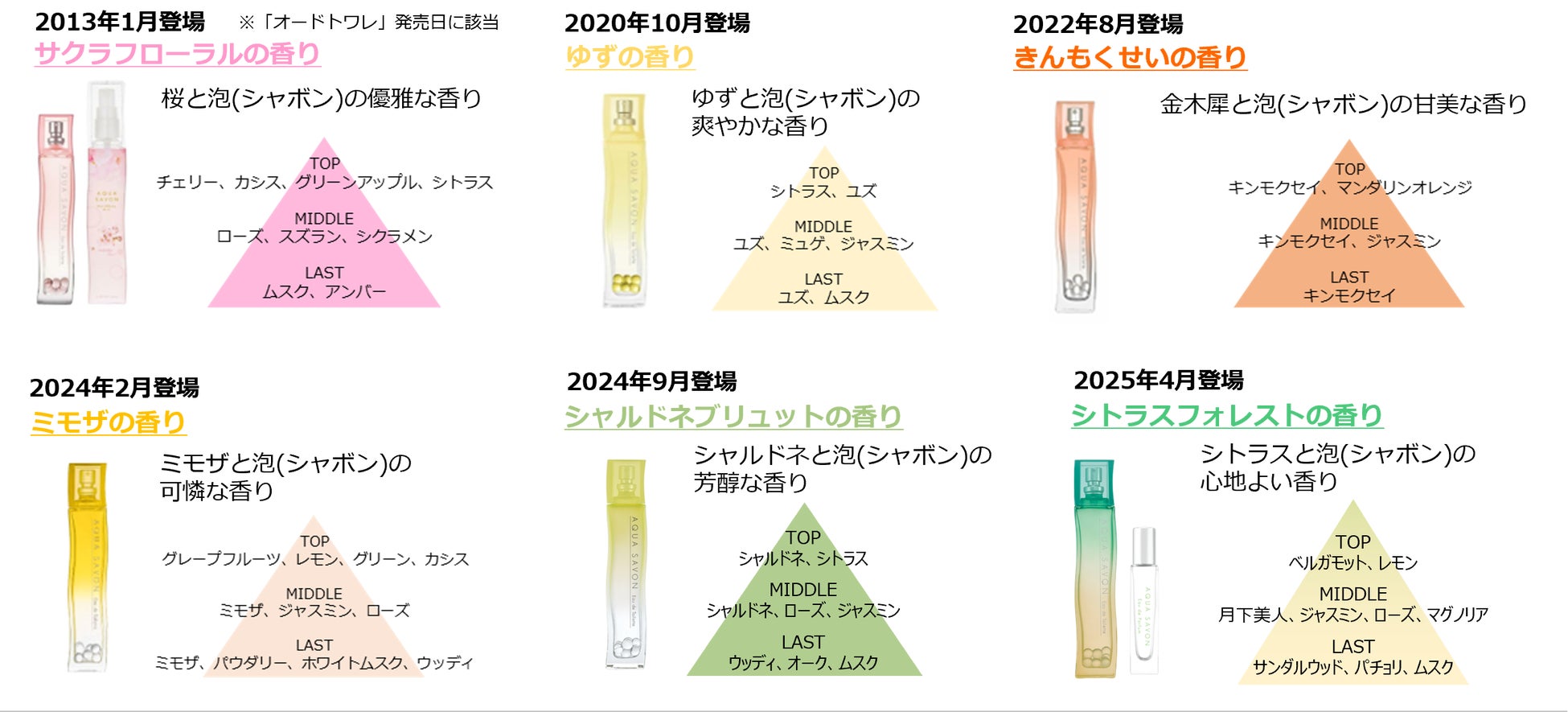 2009年5月に「オードトワレ」2種を発売以来、誰からも愛される“泡(シャボン)の香り”が、軽い香りを好む日本人に支持され続けるロングセラーブランドです。人気アイテムである「オードトワレ」と「ヘアー&ボディミスト」は累計販売数500万本(※4)を突破するヒット商品に成長。また、2025年4月から「オードトワレ」で人気の香り3種と季節限定の香り1種の「オードパルファム」もラインナップに仲間入りしました。香りの種類は「一年中、使いやすい定番のせっけんやシャンプー、柔軟剤の香り(1)」に加えて、「旬の果物や花と泡(シャボン)を調和した季節限定の香り(2)」を展開。どちらも高い人気を得ております。