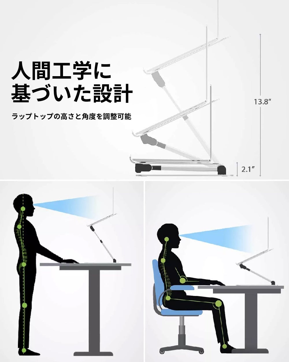 MacBookなど17インチまでのノートPCに/長さ調節可能/丈夫なアルミニウム素材/姿勢改善