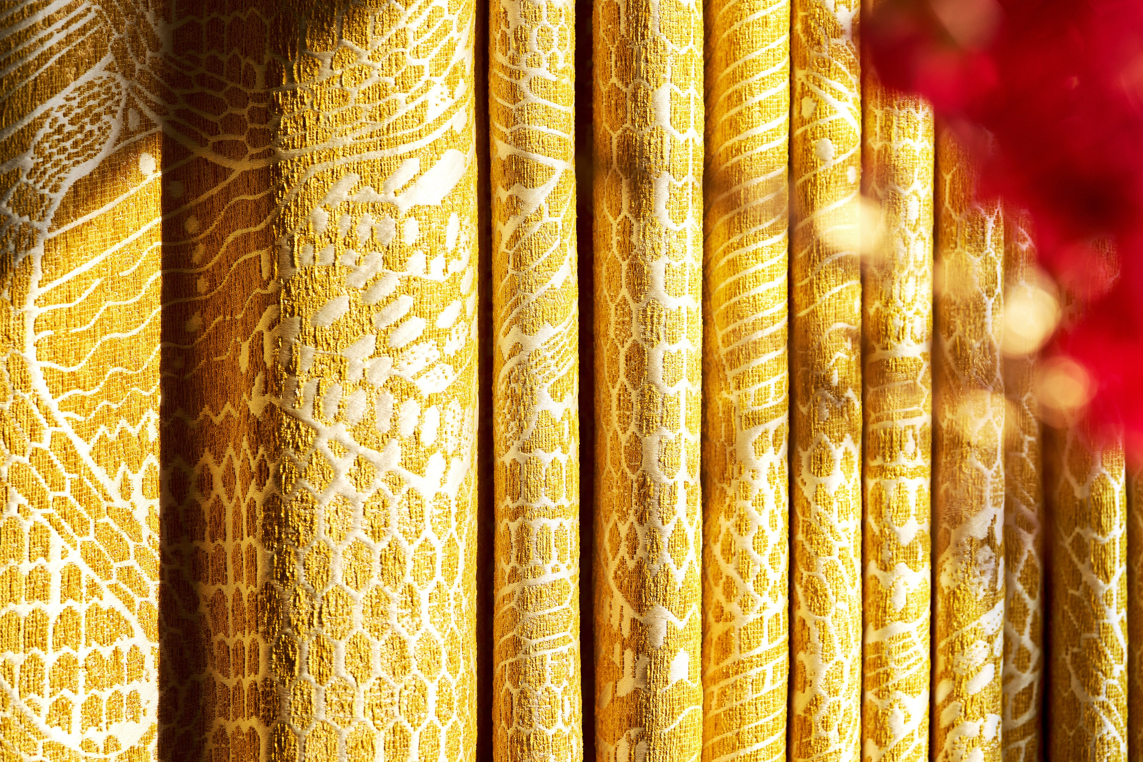 ブランドのアイコンである「セルペンティ」モチーフのエレガンスと神秘性を反映するよう装飾されており、ヴェネチアの歴史あるルベッリ社の生地で制作されたカーテンとクッションや(北京、上海、バリを除く)、肌触りの良いカシミアのブランケットが心地よいくつろぎをもたらす魅惑的な雰囲気を作り出します。1970年代のブルガリの広告キャンペーンや「セルペンティ」に関する書籍も展示されています。