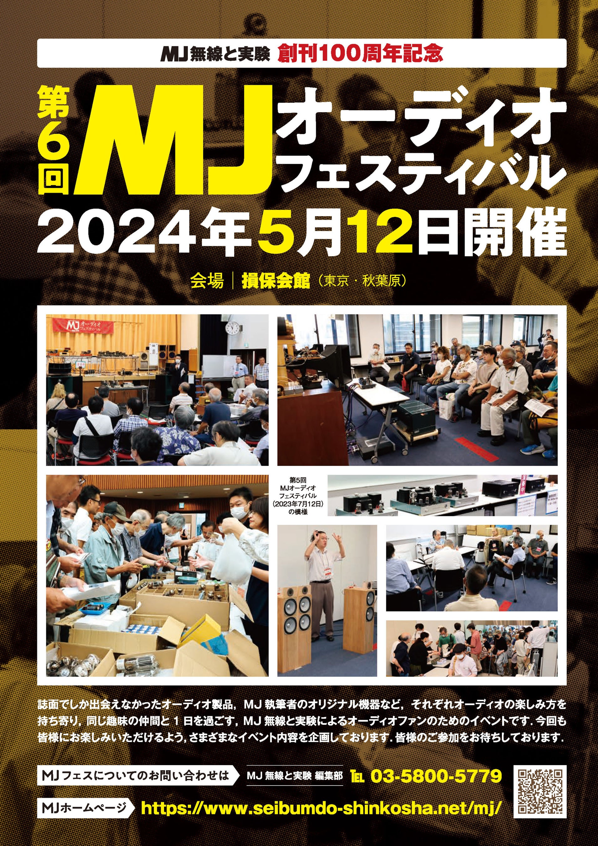 オーディオ機器の自作記事とオーディオテクノロジーの解説をメインコンテンツとする総合オーディオ雑誌『MJ無線と実験』(季刊、3月、6月、9月、12月、10日発売)では、恒例の『MJオーディオフェスティバル』を令和6年5月12日(日)に、秋葉原・損保会館を会場として開催します.