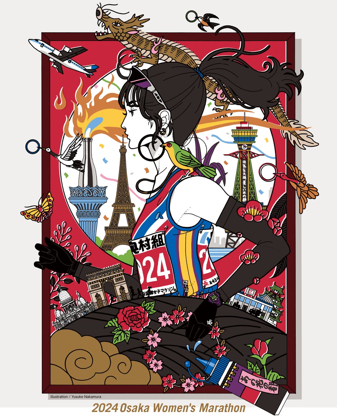 「2022年から3回目のメーンビジュアルを担当させていただきました。2024年の大阪国際女子マラソンはパリオリンピックの選考としてとても重要な大会ですので、『〝花〟の都・巴里』と新年らしい『日本の〝花〟札』を掛け合わせて力強く描きました。従来の時鳥(ホトトギス)は大阪のシンボルである百舌鳥(モズ)に姿を変えていますが、空を飛ぶ生き物それぞれが5つの輪を持っていま飛び立ちます。ランナーの皆さまのご健闘と大会の成功を心よりお祈り申し上げます」