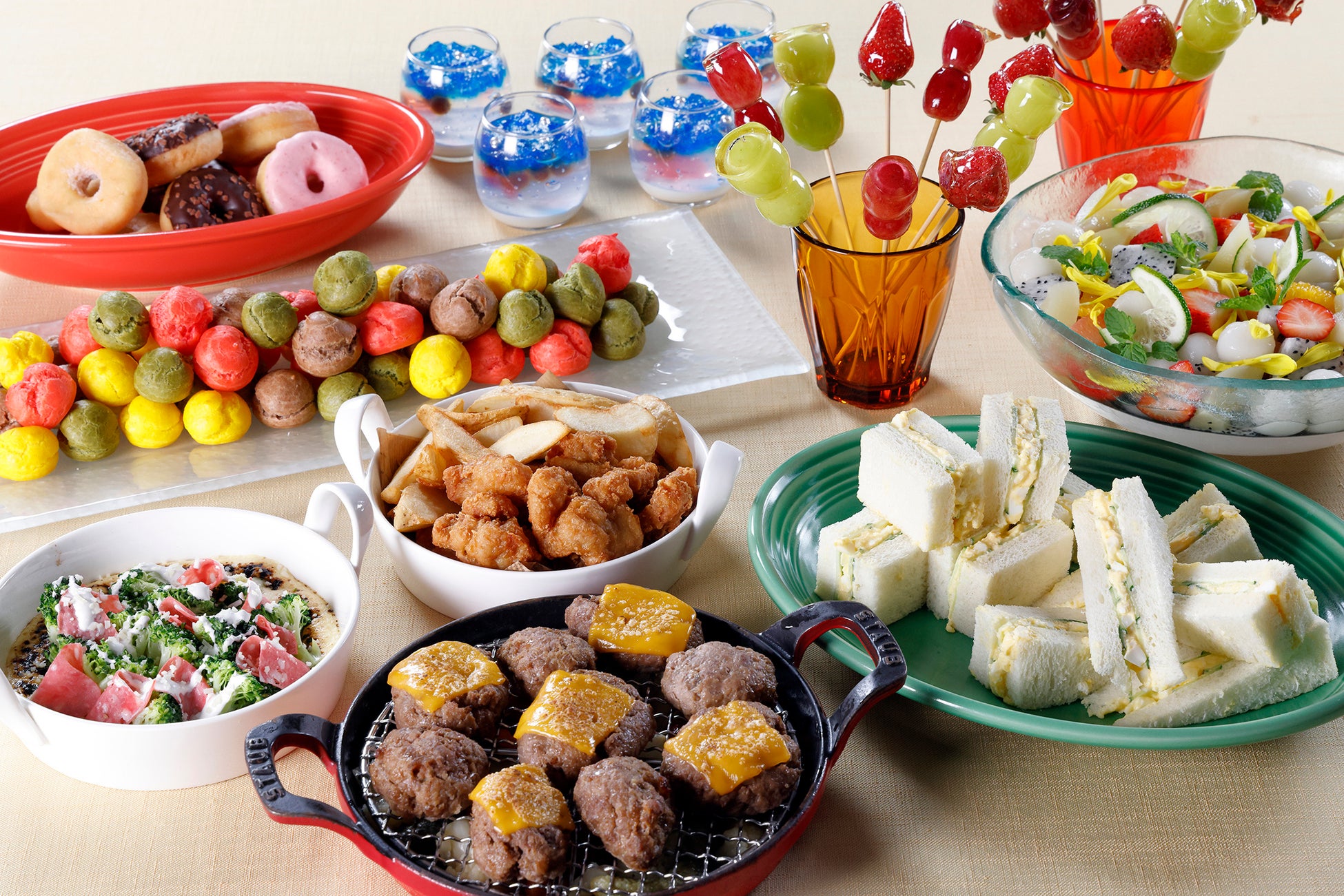 九州うまかもんブッフェに加え、「プチハンバーグ」や「グラタン」、ディナータイムには「フルーツ飴」などご家族でお楽しみいただけるメニューが登場します。