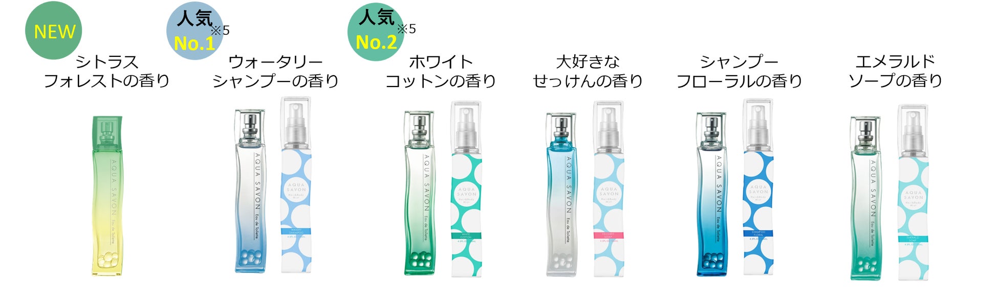性別や年齢を問わず、爽やかで清潔感のある香りを好む方にお使いいただける「アクア シャボン」、子どもを持つママ向けの「ママ アクア シャボン」、あらゆるアクティブシーンにフィットする「アクア シャボン スポーツ」、おうちで愉しむ香りを提案する「ホーム アクア シャボン」があります。