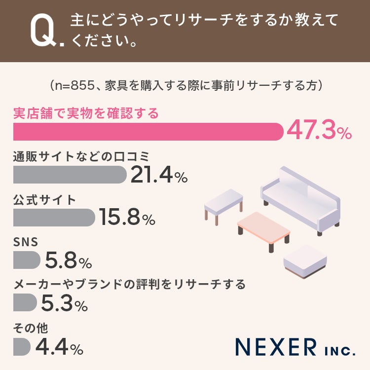 家具を購入する際、主にどうやってリサーチをするか調査を行いました。