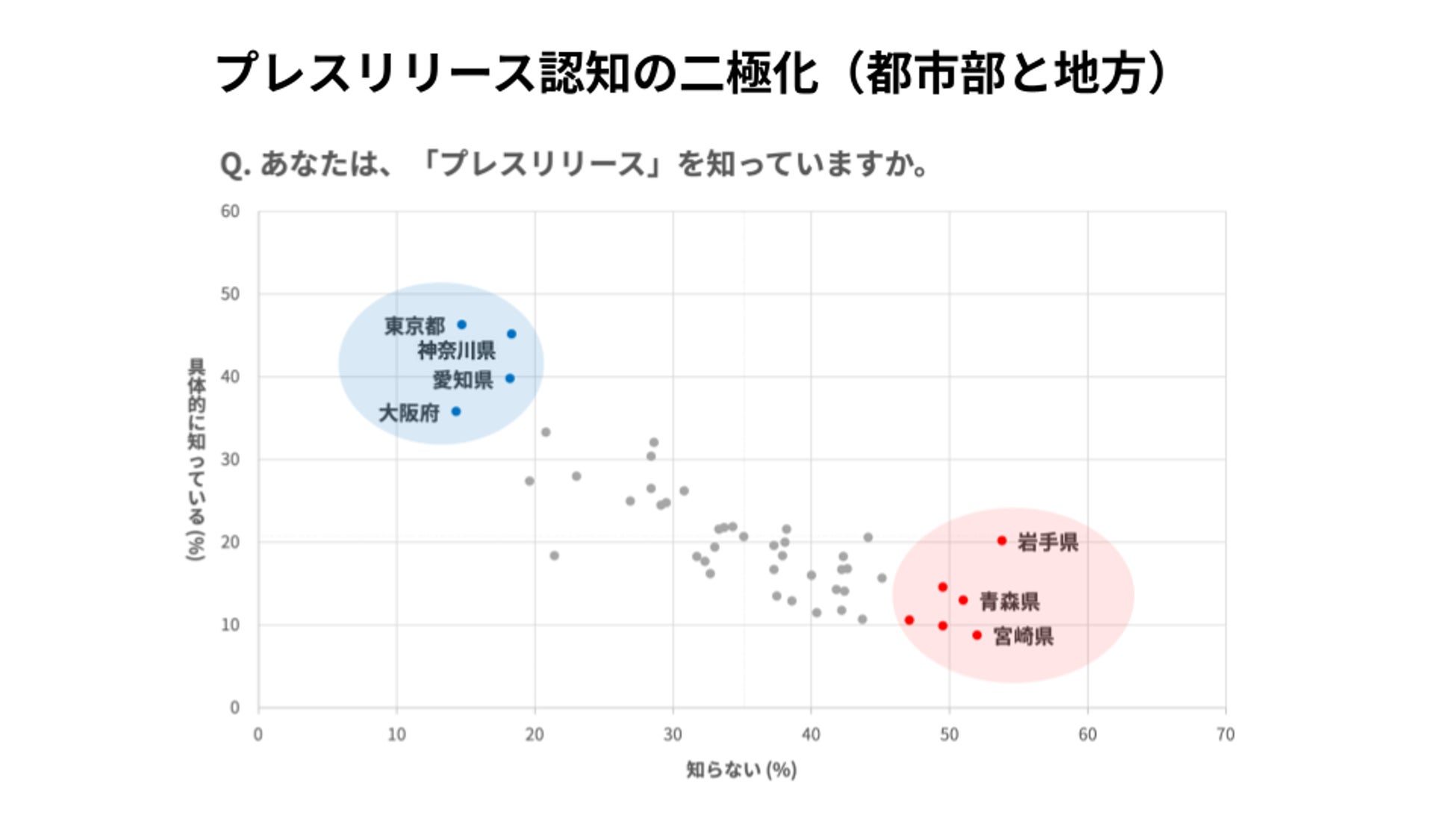 しかし、当社が日本全国のビジネスパーソン4839名を対象に実施した調査(2025年9月29日~2025年10月8日集計)では、「プレスリリース」自体の認知度を図る設問において、「具体的に知っている」と回答した上位5都市は東京都、神奈川県、愛知県、大阪府、兵庫県と都市部に集中し、「知らない」と回答した上位5都市は岩手県、宮崎県、和歌山県、沖縄県、香川県という結果となり、プレスリリースの認知度に地域差があることがわかりました。