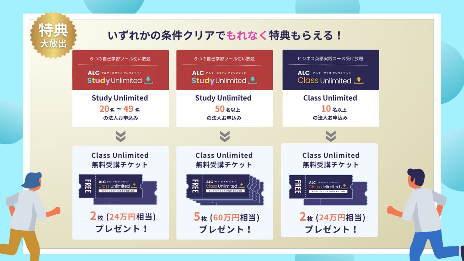特典内容: ビジネス英語研修プログラム「ALC Class Unlimited」6か月間の通常プログラムを無料でご受講いただけるチケット(1枚12万円相当)をプレゼント!