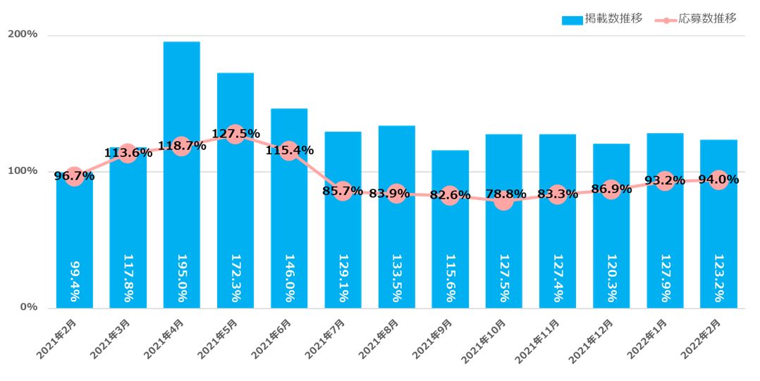- 2022年2月の掲載数は123.2%で、12カ月連続前年同月比100%超え。企業の採用意欲は引き続き旺盛【図1】