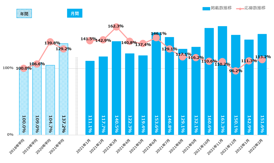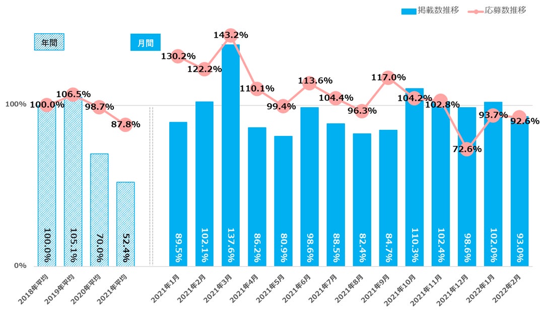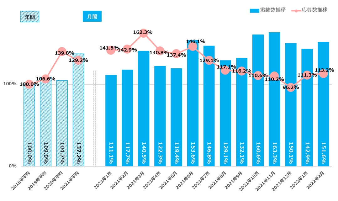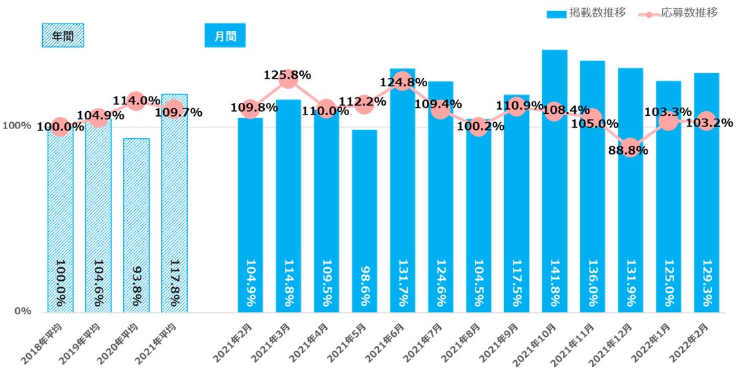 2018年平均を基準とすると、2022年2月の掲載数は129.3%、応募数は103.2%となっている【図1_2】。