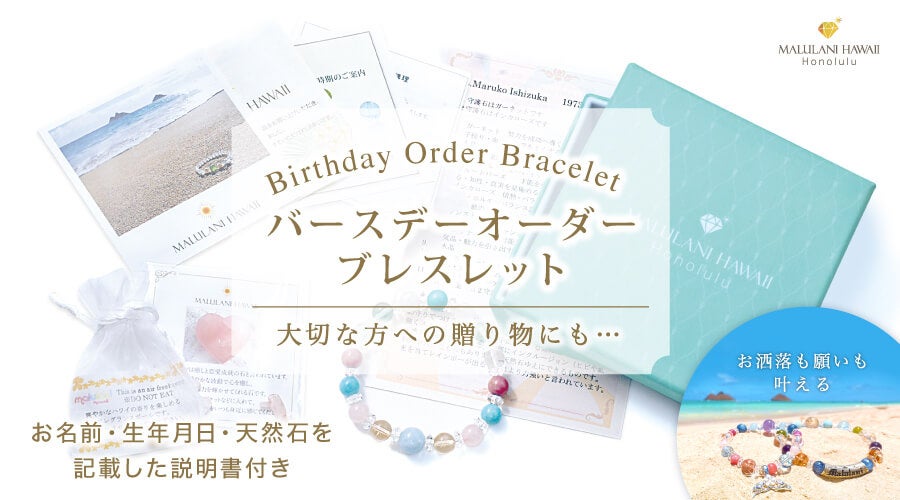 マルラニハワイを代表する「バースデイオーダーブレスレット」は、生年月日より守護石を算出し、お願い事の石と組み合わせて作る、世界にひとつのオーダーメイドです。
