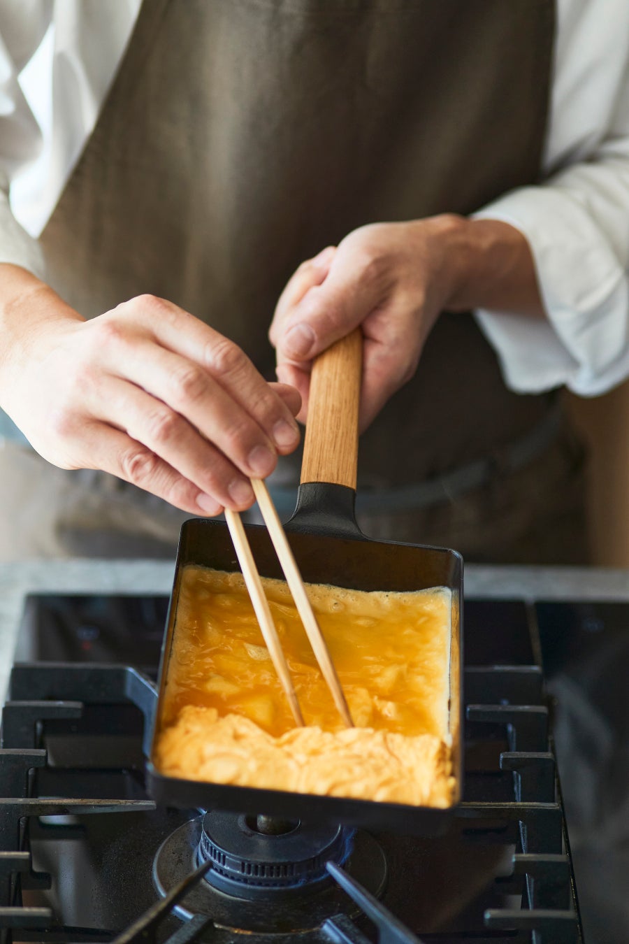 蓄熱性が高い鋳物と瞬間蒸発ホーローにより、卵本来の味を引き出し最高のおいしさを実現します。鋳物の限界まで底面内側の角を小さく、垂直に立てた側面の形状により卵液を広げやすく、カタチもしっかり決まるのでプロのような玉子焼きができ上がります。