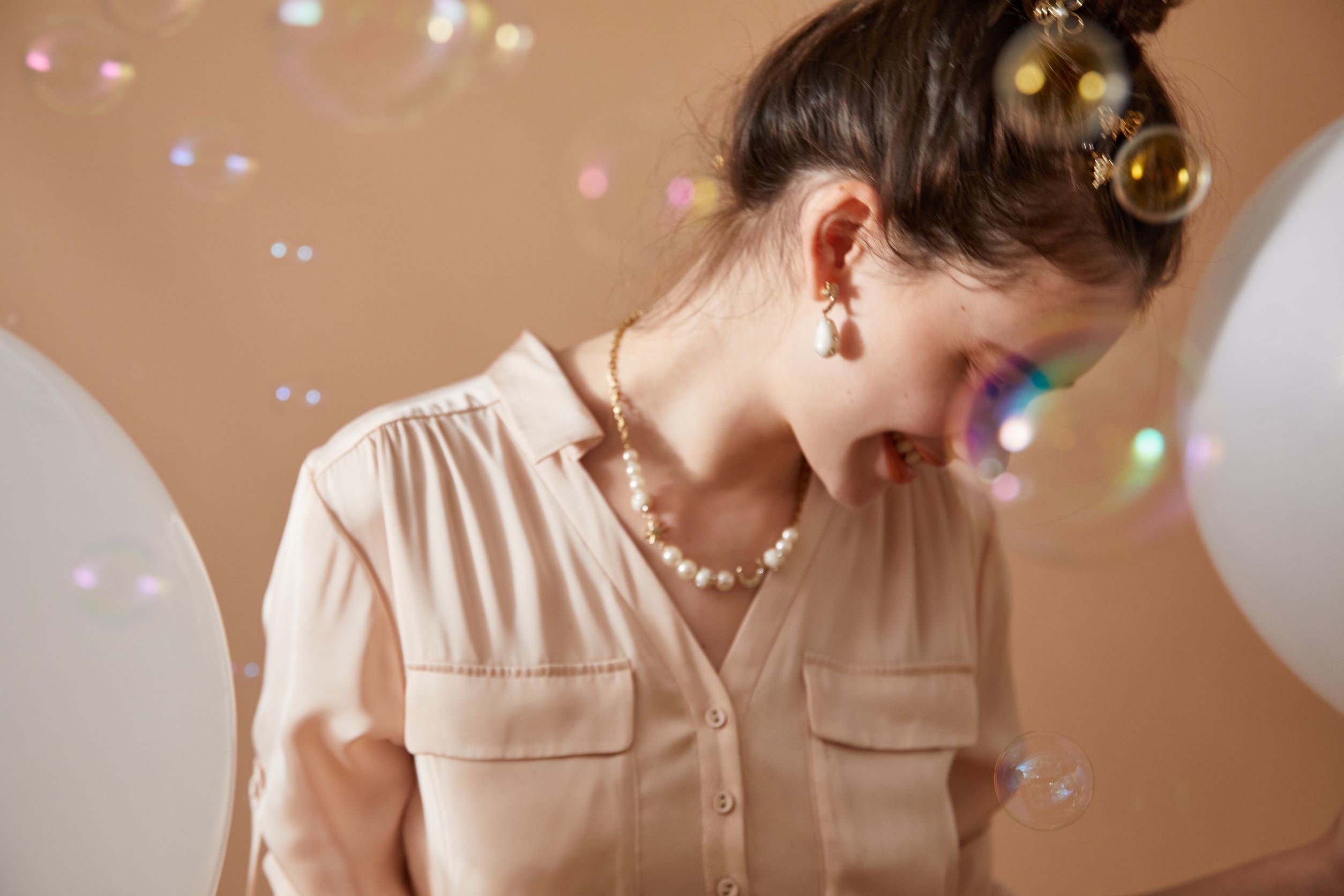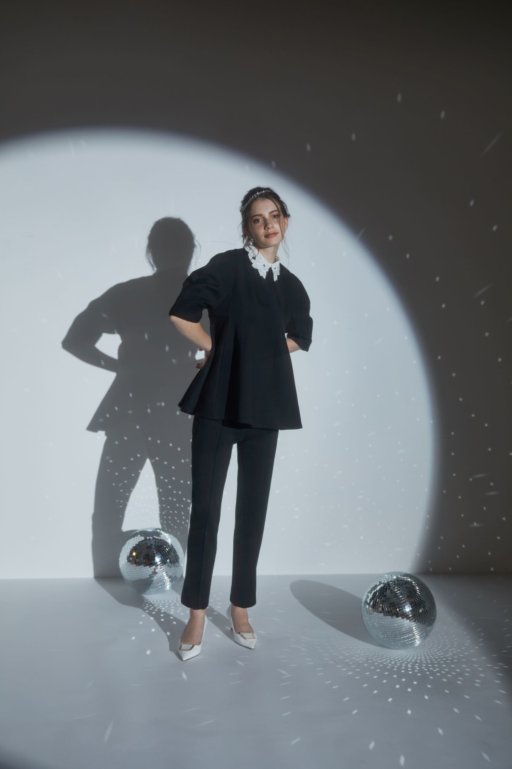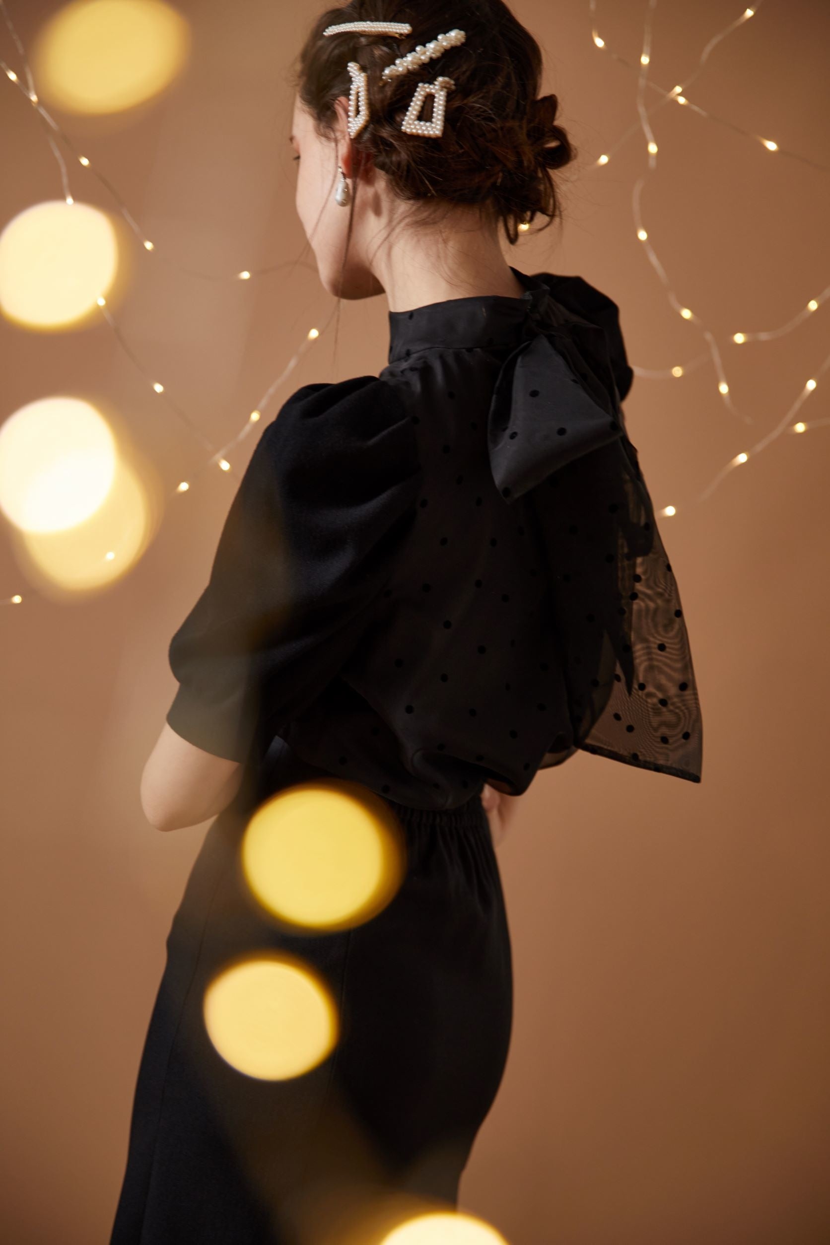 同色のマーメイドスカートにタックインしてリボンを後ろで結べば、華やかで女性らしいバックシャンスタイルを楽しめます。上質なオーガンジー素材を使っているので、黒でも重くならず軽やかに仕上がります。レセプションパーティーや食事会など、煌びやかなシーンで好印象を残してくれる、頼れるブラウスです。