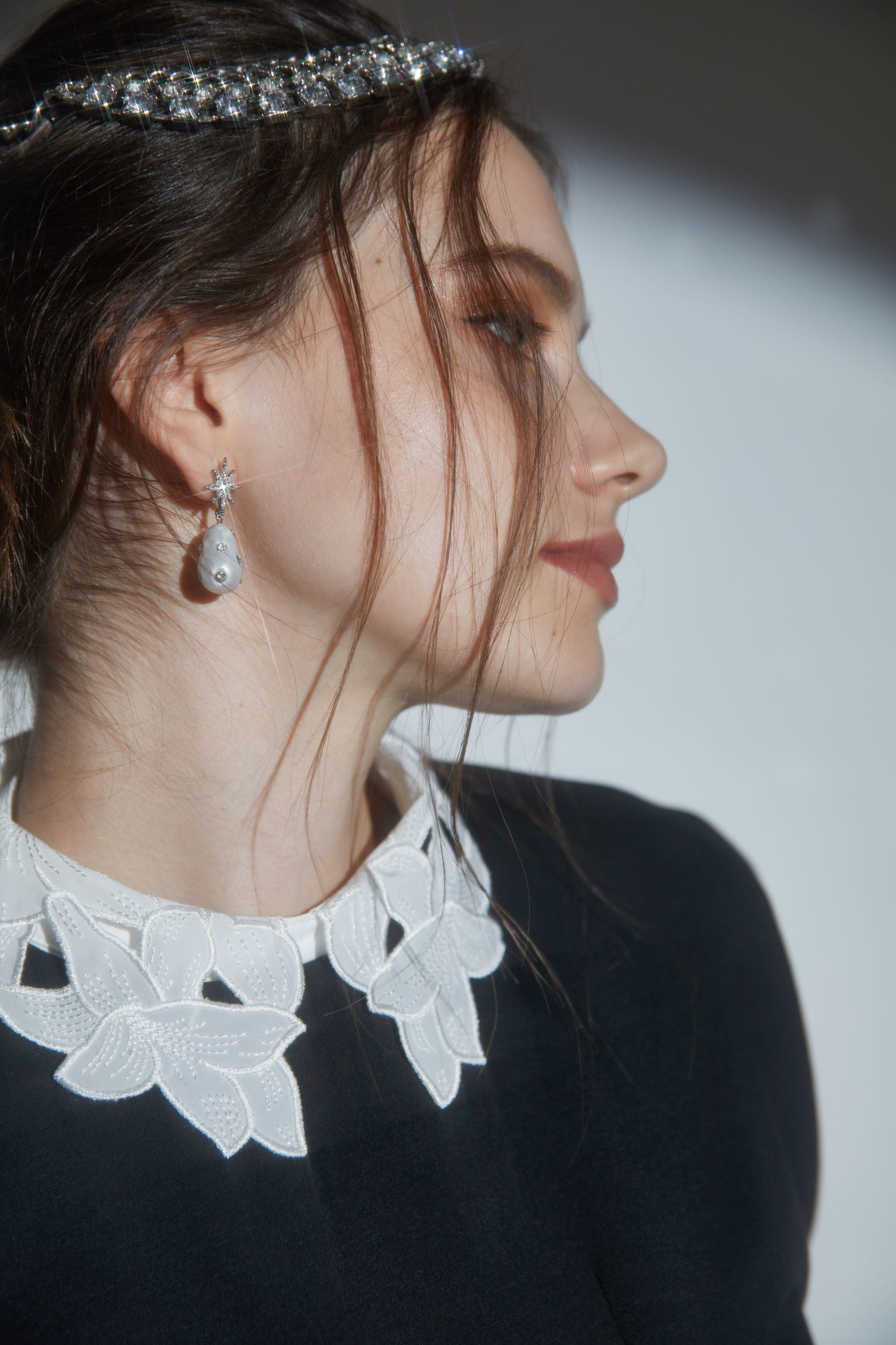 百合がモチーフになった襟の刺繍が、凛とした印象をもたらします。