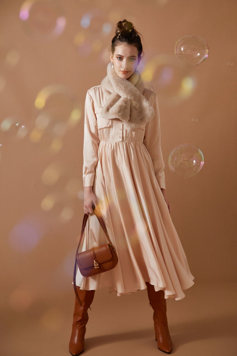 優雅に揺れ動くハンカチーフヘムと、たっぷり入ったギャザーがドラマチックなワンピース。大人の肌に映えるライトピンクは、オンオフ問わず女性らしい煌びやかなムードに魅せてくれます。袖は折り上げて短く留められる仕様になっているので、秋から冬本番まで様々な着こなしを楽しめます。