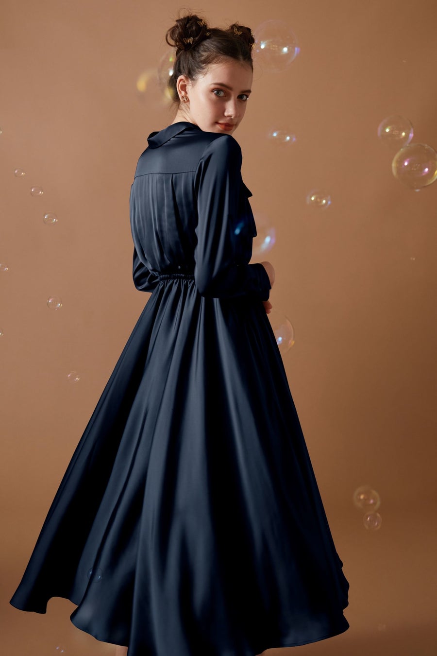 王道のネイビーを選ぶとどんな羽織りとも馴染みがよく、シーンを選ばず艶やかで上品な装いに仕上げてくれます。胸元のポケットディテールや華奢見えするVネックなど、細部に渡って着映えるディテールが施されているのもポイント。後ろゴムウエストになっているので、見た目以上に着心地は軽やかです。