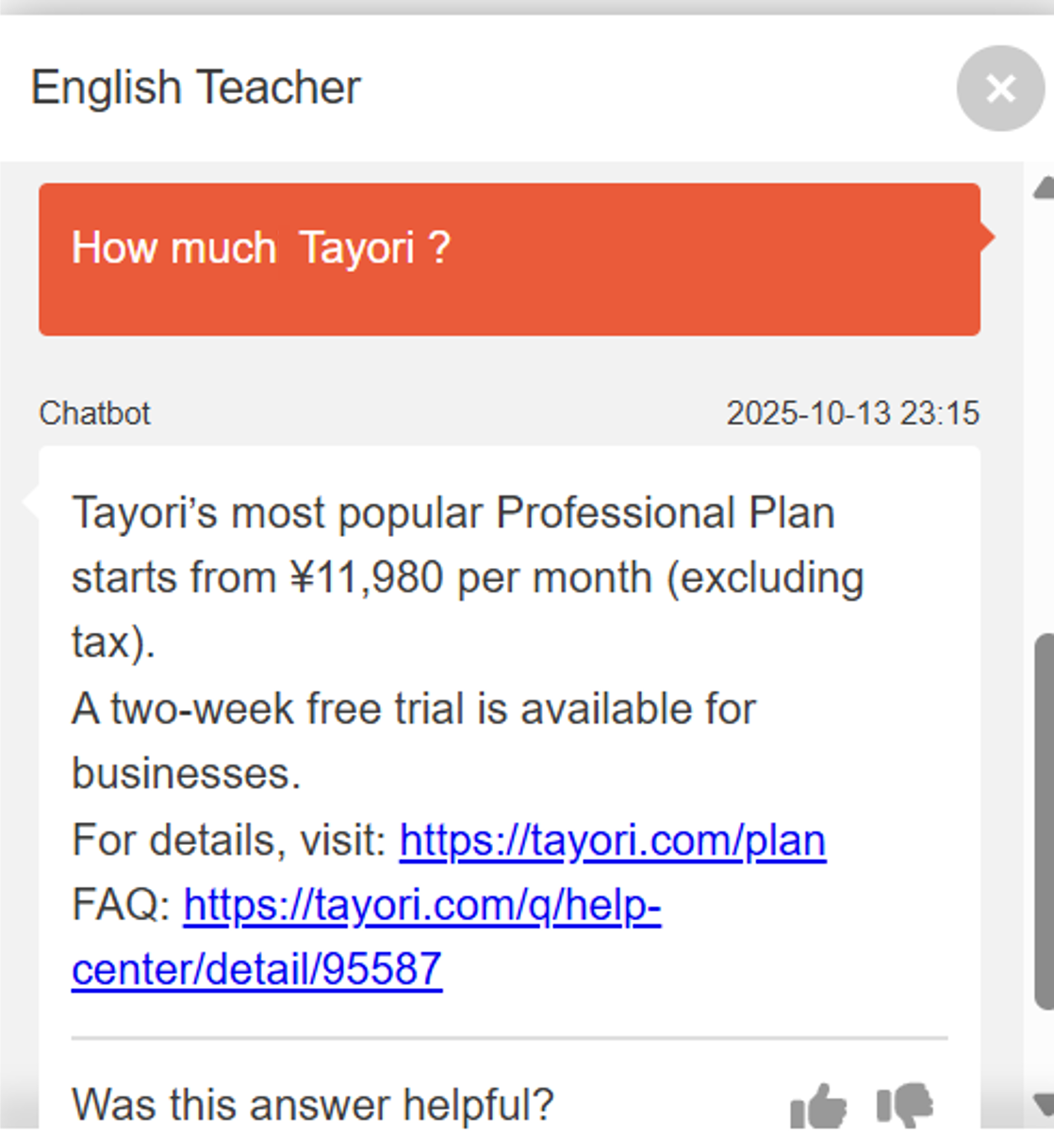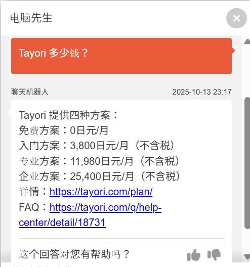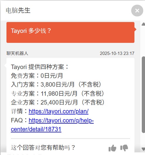 Tayoriは月額約1万2000円からAIチャットボット利用が可能