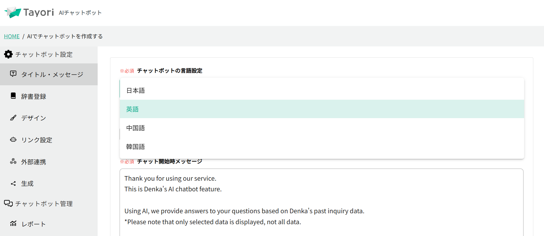 世界的に利用される英語、訪日外国人として多い中国語、韓国語に対応をいたしました。各言語のFAQをTayori上で作成し、AIチャットボット連携ボタンをクリックし、管理画面の言語設定を選択するだけで作成が可能となります。