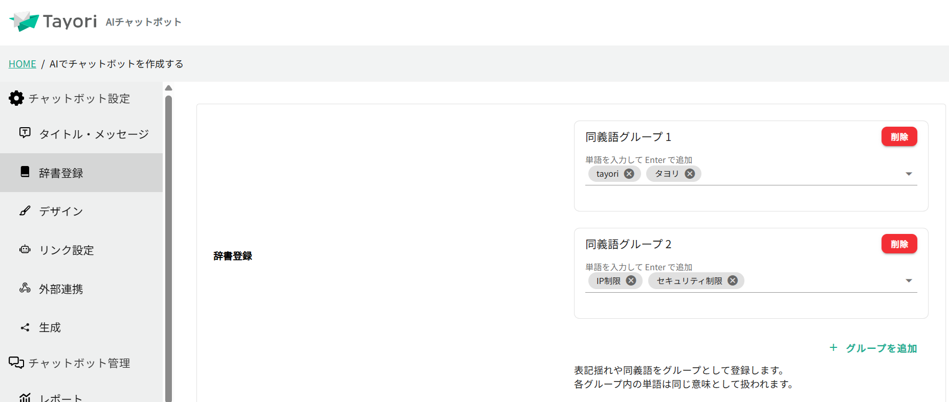 多言語機能とあわせてAIチャットボットの辞書登録機能を追加しました。AIチャットボットにおいては、あらかじめ質問と回答を登録しておく辞書型が存在します。その優位性は、一般的な辞書にはない専門用語や略称についても対応できることが挙げられます。一方で、複数パターンに渡り登録する必要やメンテナンスが求められてきました。これまでTayoriはFAQをベースに回答を作成できるためメンテナンスや作り込みは不要ですが、FAQにないものは回答として出せず、専門用語の言い回しパターンなどの回答精度に課題が残っていました。今回のリリースにおいて作りやすさとメンテナンスのしやすさを細かなレベルまで実現することが可能となりました。