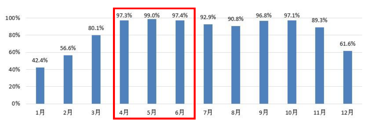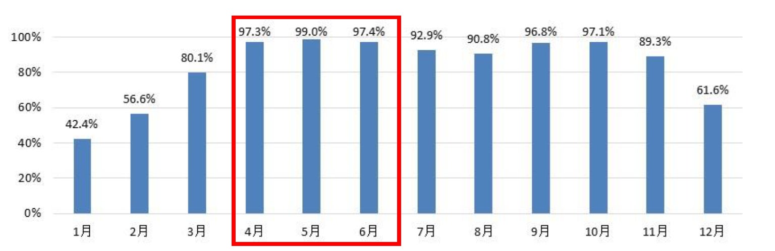 運動部学生のうち就職活動経験者・予定者に就職活動に対する不安を聞いたところ、「就職できるかどうか」が最も多く70.3%だった。次いで、「学業や部活動と両立できるかどうか(33.9%)」「スケジュールが過密になり大変になりそう(26.5%)」が続いた。運動部学生の競技活動シーズンについては、「4月~6月」と回答した割合が97%以上と高く、新卒採用広報が解禁される3月から選考が開始される6月までとほぼ重なっている。限られた時間の中で運動部の活動と並行して就職活動を行うため、スケジュールの調整や部活動との両立に不安を抱えている運動部学生が多いようだ。【図1、2】