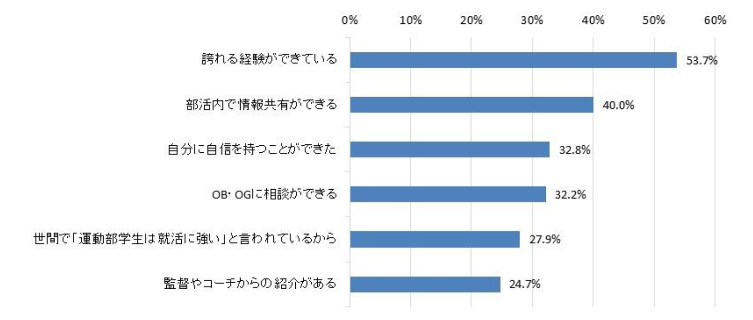 運動部学生は就職活動に有利かどうか聞いたところ、「有利だと思う」と回答した割合は77.5%だった(「有利だと思う(39.3%)」+「どちらかというと有利だと思う(38.2%)」の合計)。理由としては、「誇れる経験ができている(53.7%)」「自分に自信を持つことができた(32.8%)」など部活動の経験を糧にしているものや、「部活内で情報共有ができる(40.0%)」「OB・OGに相談できる(32.2%)」といった人間関係の強みがあがった。【図3,4】