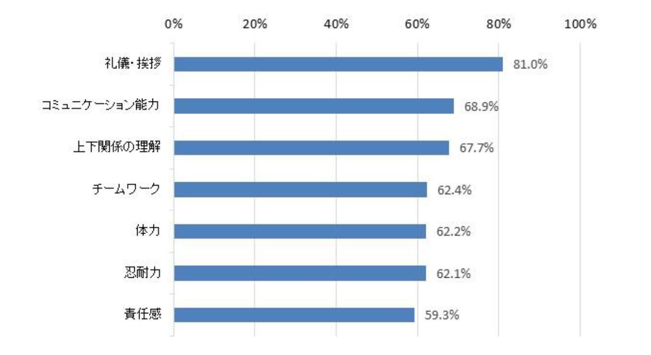 運動部の活動を通じて身についた強みの上位3位は、「礼儀・挨拶(81.0%)」「コミュニケーション能力(68.9%)」「上下関係の理解(67.7%)」だった。そのほか、「チームワーク(62.4%)」「体力(62.2%)」「忍耐力(62.1%)」も割合が高く、異なる年代・年齢で構成された競技チームにおいて、コミュニケーション方法や振る舞いを身につけている様子が見てとれる。【図5】