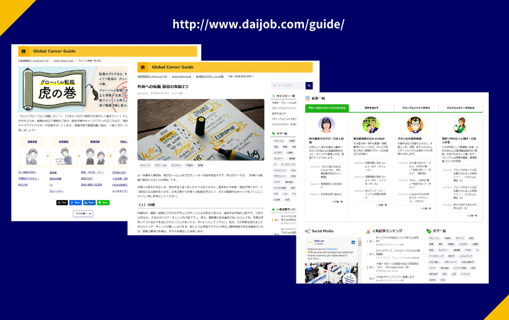 当社運営のDaijob.comは、これまで「日本語サイト:グローバル転職NAVI」、「英語サイト:Careers Advice」のページで、外資系・グローバル企業の転職に関する情報を届けてまいりましたが、この度「Global Career Guide」として新たにサイトをオープンいたしました。初めての転職希望者から、キャリアアップに挑戦し続けるミドル層に至るまで、グローバルキャリアに興味のあるすべての人を対象に、最新のグローバルトレンドや転職ノウハウなどの情報発信にますます力を入れていきます。