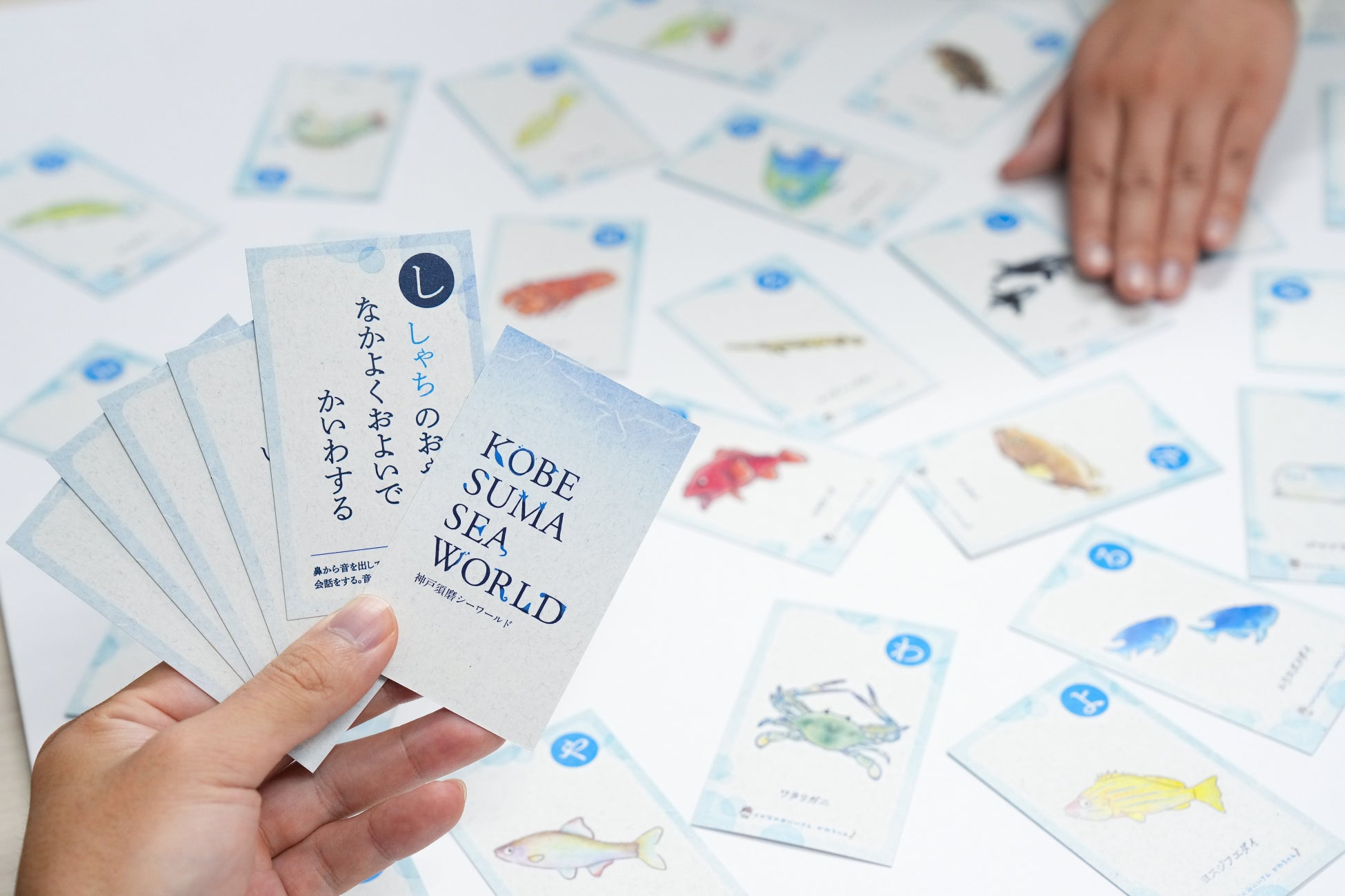 株式会社マテックス(モリト株式会社のグループ会社)が繊維廃材から再生したリサイクルペーパー「ASUKAMIⓇ(アスカミ)」から制作しており、イラスト・監修はさかなのおにいさん かわちゃんが手掛けています。神戸須磨シーワールドで展示している生きものが題材となっており、生態や特徴を学べる楽しいかるたです。