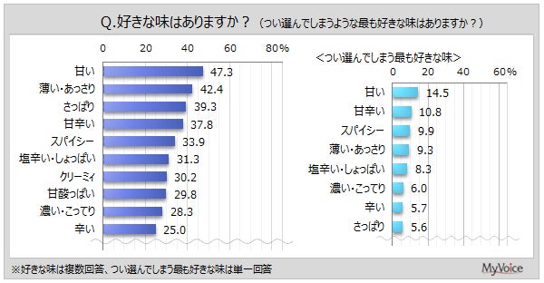 ■好きな味は「甘い」「薄い・あっさり」が各40%台、「さっぱり」「甘辛い」が各4割弱。つい選んでしまう最も好きな味は「甘い」が約15%、「甘辛い」「スパイシー」が1割前後