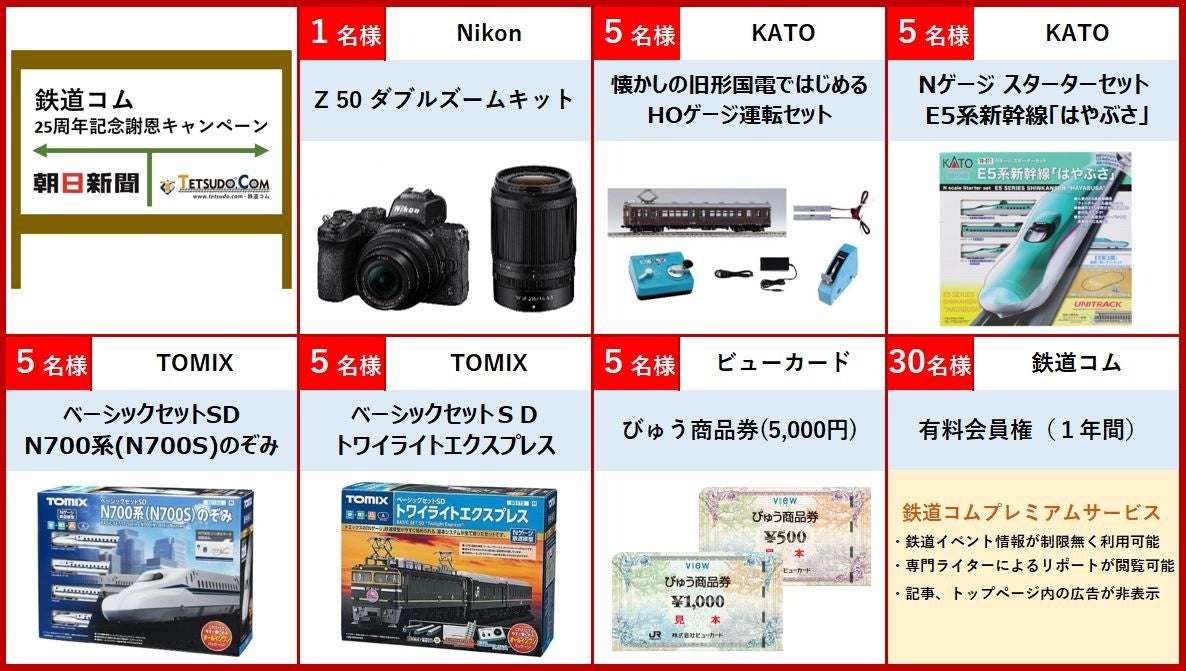 株式会社朝日新聞社(代表取締役社長:中村史郎)のグループ企業、朝日インタラクティブが運営する「鉄道コム(Tetsudo.com)」( https://www.tetsudo.com/ )が開設25周年を迎えました。これを記念して、日頃からご愛顧いただいている鉄道ファンのみなさまへ感謝の気持ちを込めて、鉄道関連の賞品を抽選で計56名様にプレゼントします。応募期間は2024年2月1日(木)~3月6日(水)で、以下から1つお選びいただけます。