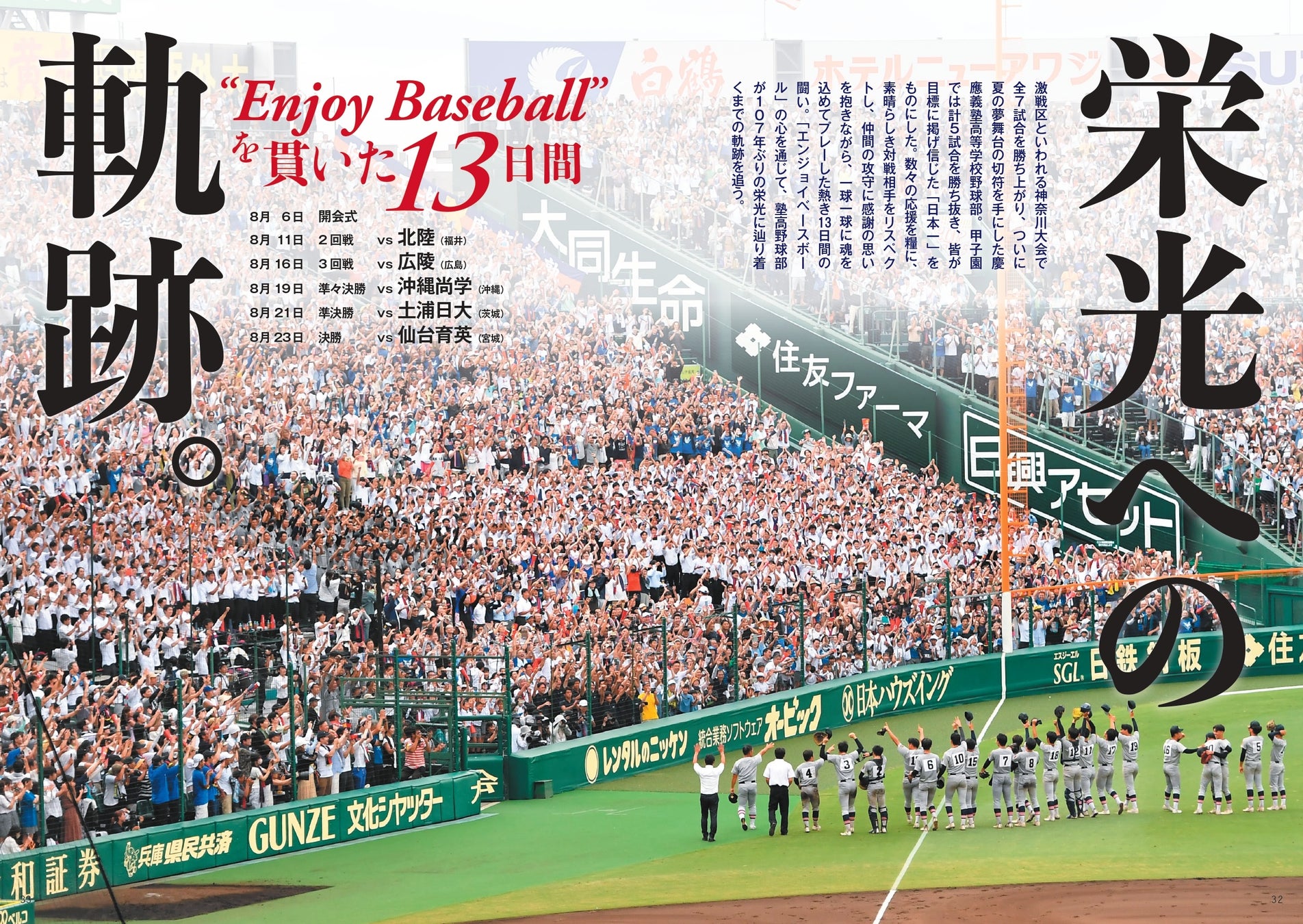 激戦区といわれる神奈川大会で全7試合を勝ち上がり、ついに夏の夢舞台の切符を手にした慶應義塾高等学校野球部。甲子園では計5試合を勝ち抜き、皆が目標に掲げ信じた「日本一」をものにした。数々の応援を糧に、素晴らしき対戦相手をリスペクトし、仲間の攻守に感謝の思いを抱きながら、一球一球に魂を込めてプレーした熱き13