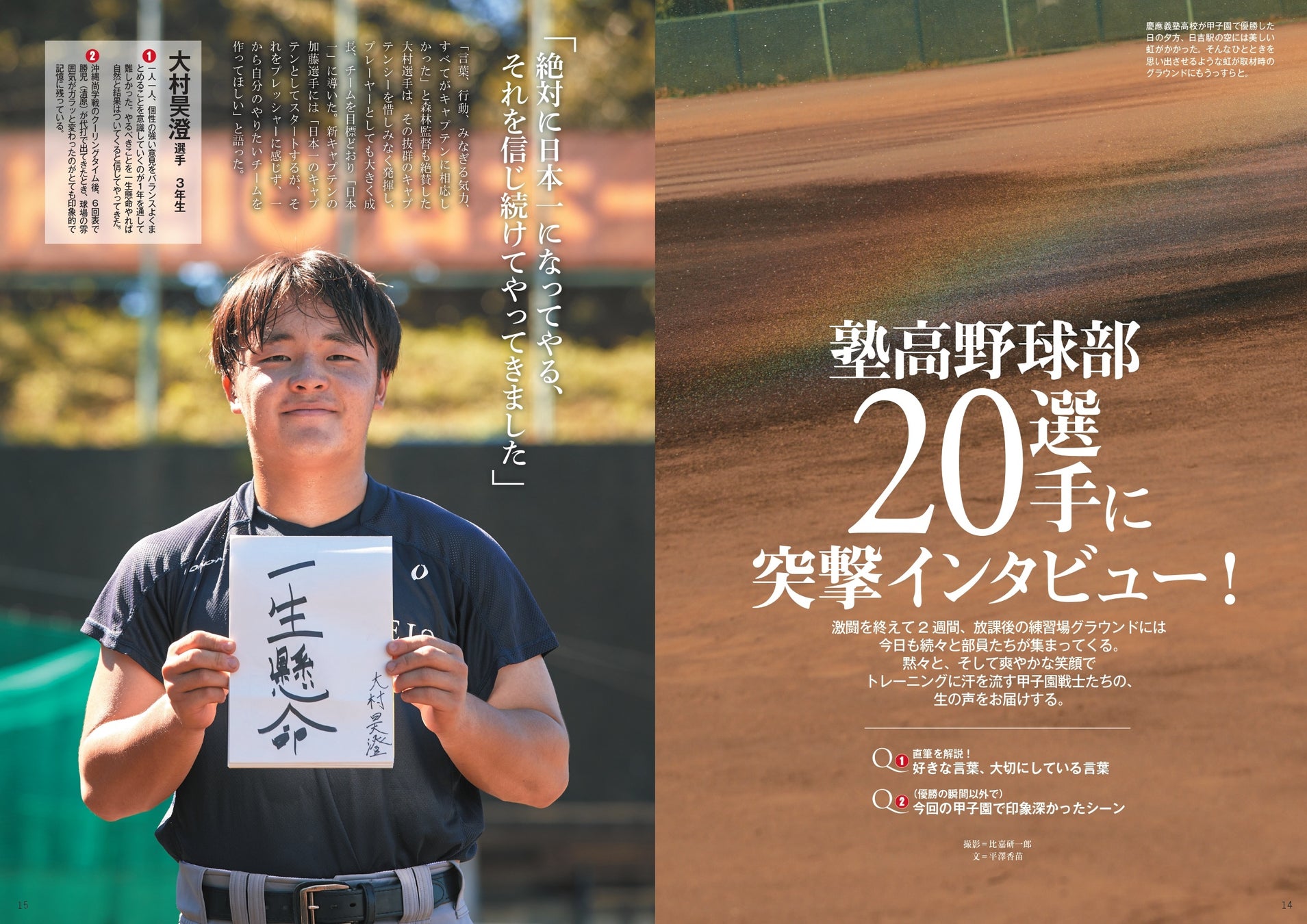激闘を終えて2週間、放課後の練習場グラウンドには今日も続々と部員たちが集まってくる。黙々と、そして爽やかな笑顔でトレーニングに汗を流す甲子園戦士たちの、生の声をお届けする。