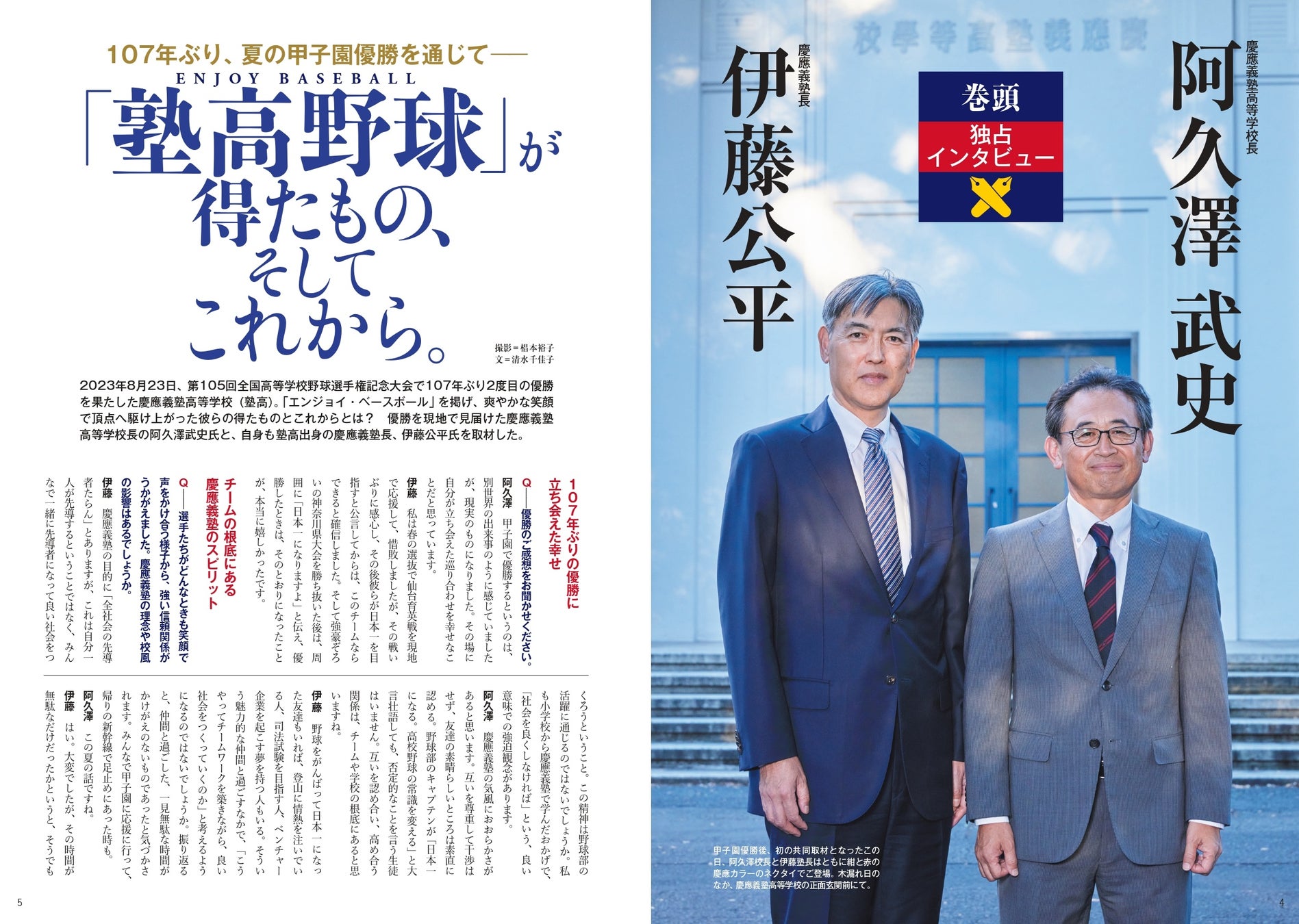 2023年8月23日、第105回全国高等学校野球選手権記念大会で107年ぶり2度目の優勝を果たした慶應義塾高等学校。「エンジョイベースボール」を掲げ、爽やかな笑顔で頂点へ駆け上がった彼らの得たものとこれからとは? 優勝を現地で見届けた慶應義塾高等学校長の阿久澤武史氏と、自身も塾高出身の慶應義塾長、伊藤公平氏を取材した。