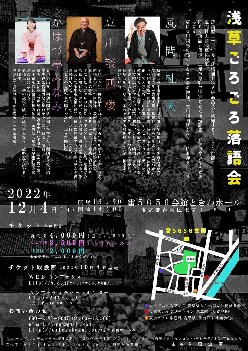 永恒企画(東京都世田谷)企画製作主催、『浅草ごろごろ落語会』が2022年12月4日(日)に雷5656会館(東京都台東区浅草3丁目6−1)にて開催されます。