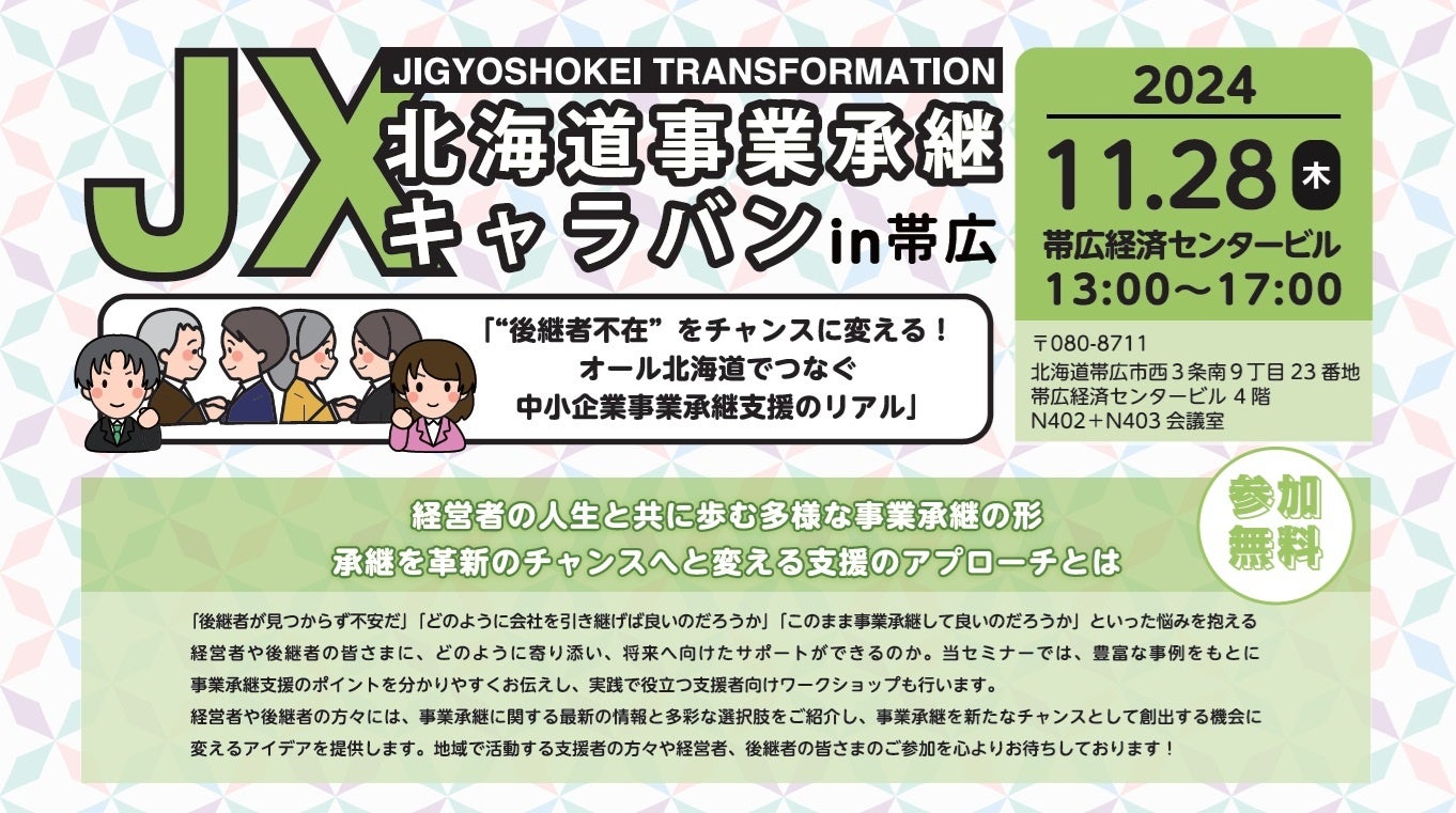 中小機構(独立行政法人中小企業基盤整備機構)北海道本部は、経済産業省北海道経済産業局、北海道事業承継・引継ぎ支援センター、公益財団法人北海道中小企業総合支援センターと連携し、事業承継をきっかけとしたイノベーションの可能性を考える「北海道事業承継キャラバンin帯広」を11月28日(木曜)に開催します。