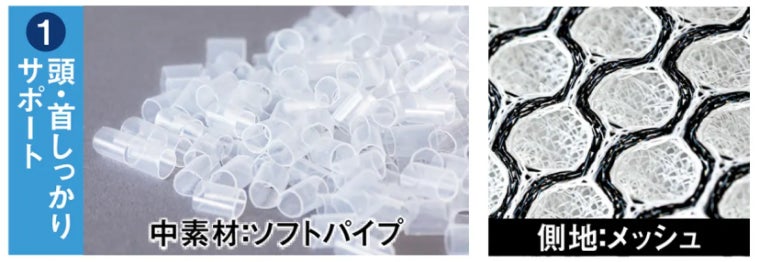 頭と首は「しっかり」サポート。頭部中央と首元は通気性がよく、ほどよい弾力のあるソフトパイプを採用。パイプが流動的に動くことで枕とのすき間を埋め、首元にフィットします。側地も通気性がよく、熱がこもりにくい立体メッシュ生地を使用しています。